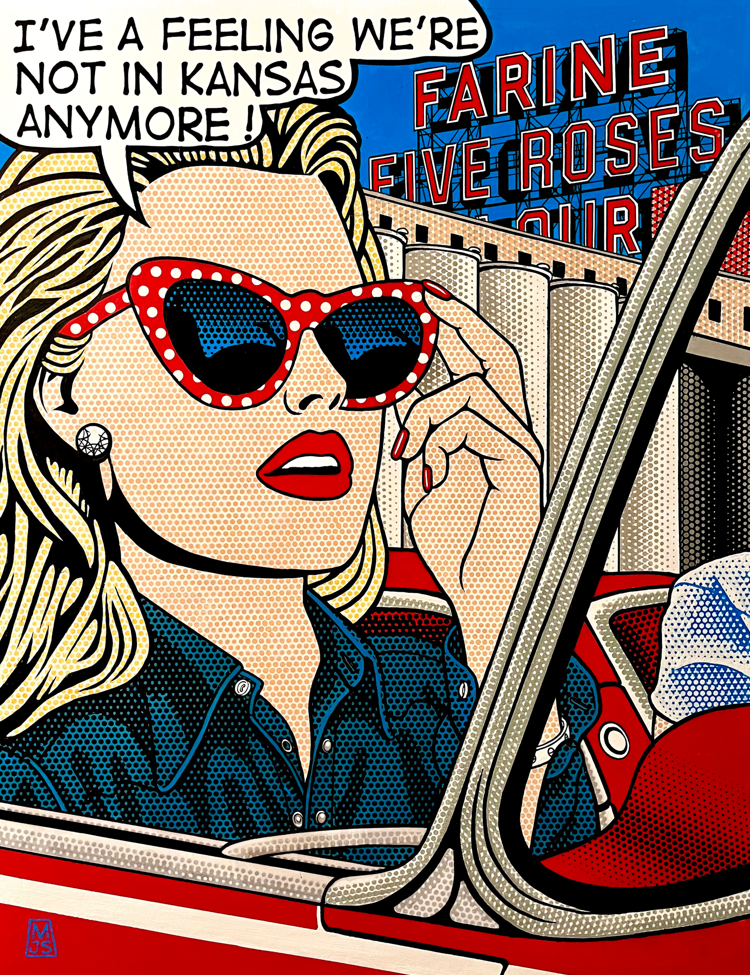 Capturing a brief moment in time between the completion of the Olympic Stadium to host the 1976 Summer Olympics, and the 1977 removal of "Flour" from the city's iconic Five Roses sign, Dotty finds herself in Montreal for the summer. The "Dotty" series began over a decade ago with Dotty (named after the style in which she's painted and a nod to Dorothy from the Wizard of Oz whom she's quoting) awakening from a dream while on a road trip, and finding herself quite far from home. Explore later works where Dotty finds herself in various cities across North America, depicted in recognizable background settings as well as in the reflections of her glasses.